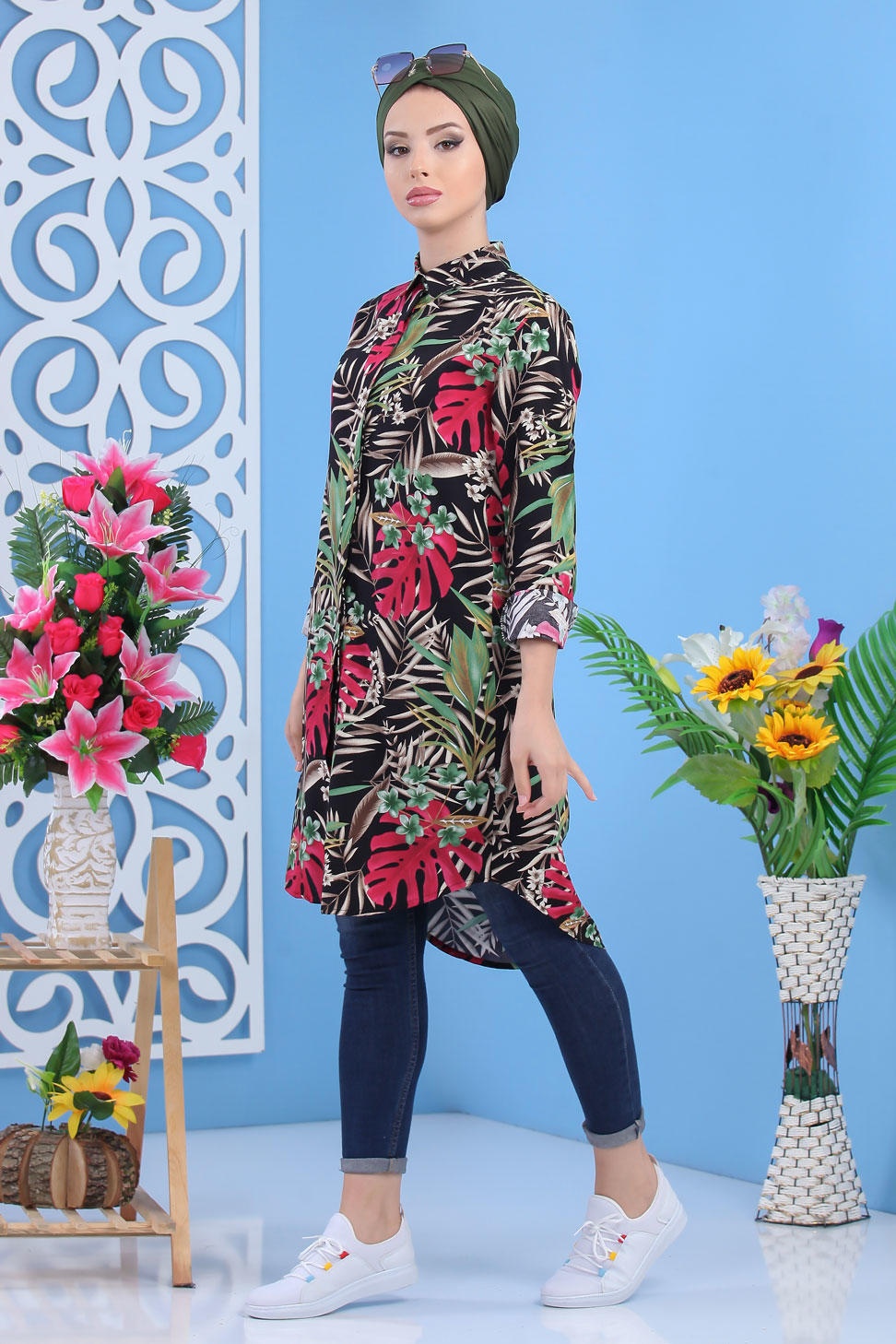 Chemise longue, col chemise, manches finition boutons aux poignets, coupe légèrement évasée, extrémités arrondies. Ce modèle à imprimés "tropical", très tendance, vous permettra de sortir du commun. Vous pourrez le porter aussi bien en journée qu'en soirée.