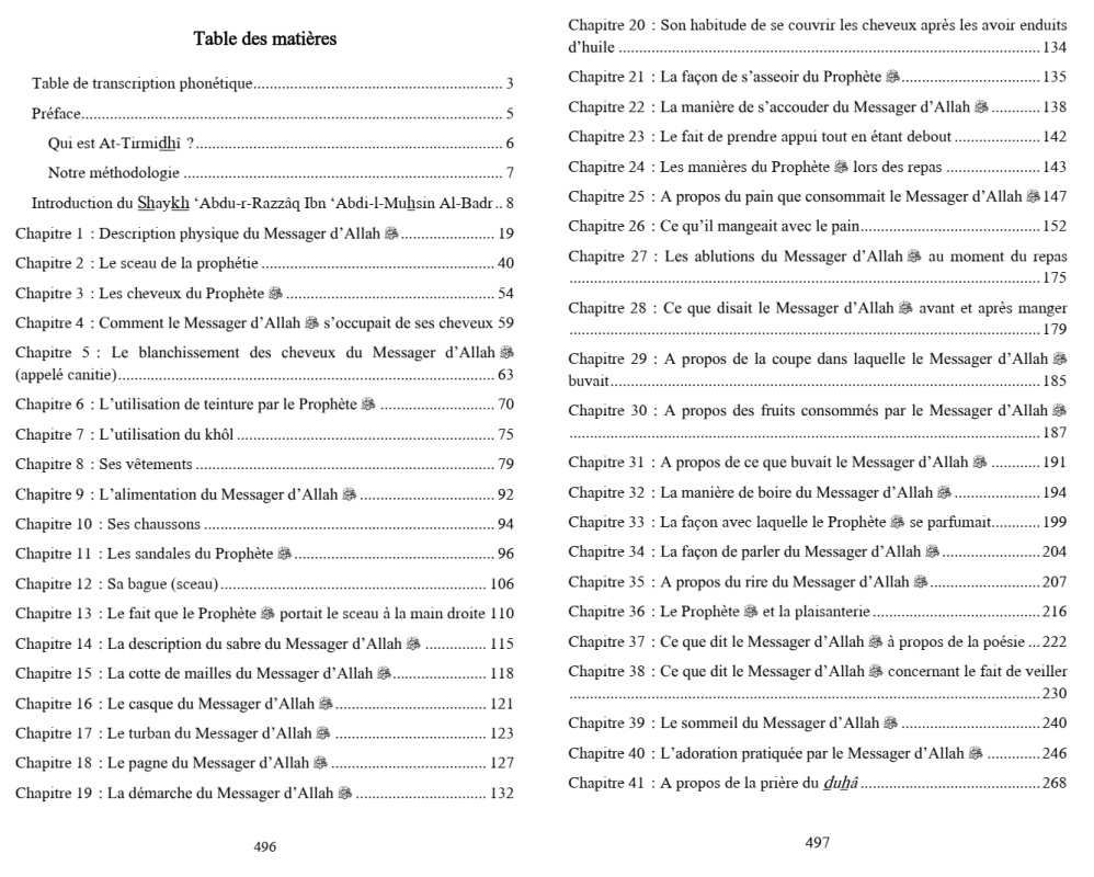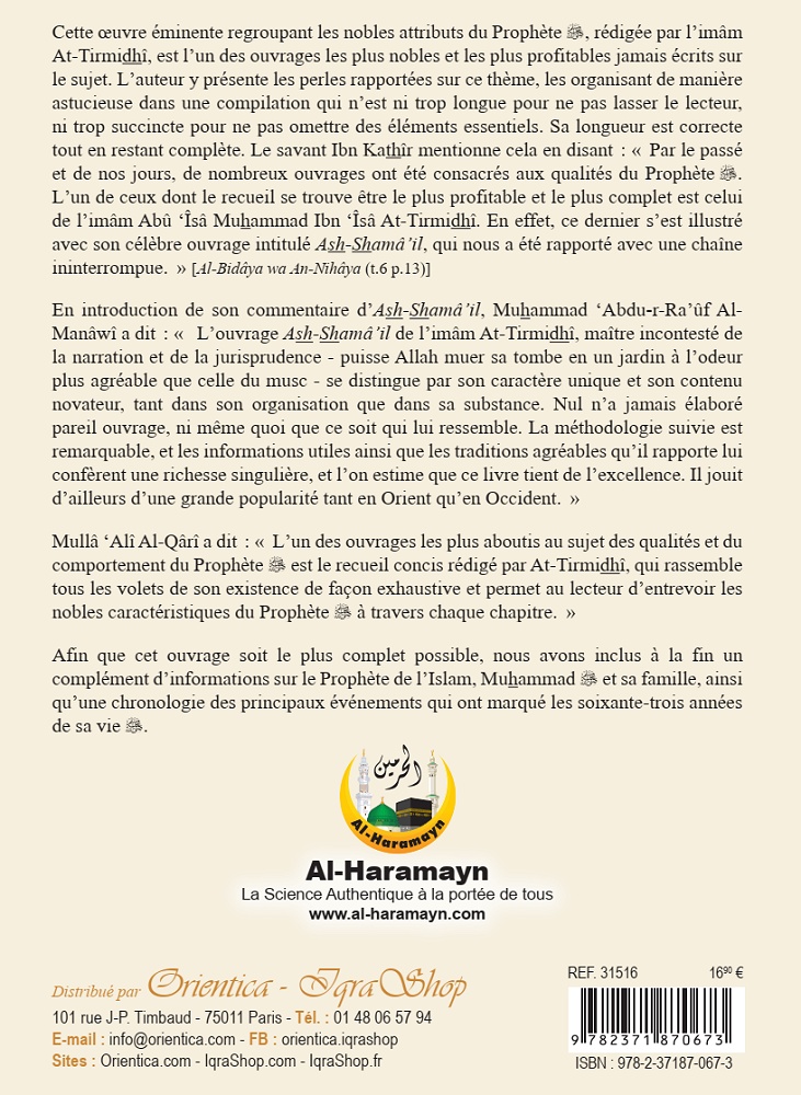 Cette œuvre éminente regroupant les nobles attributs du Prophète ﷺ, rédigée par l’imâm At-Tirmidhî, est l’un des ouvrages les plus nobles et les plus profitables jamais écrits sur le sujet. L’auteur y présente les perles rapportées sur ce thème, les organisant de manière astucieuse dans une compilation qui n’est ni trop longue pour ne pas lasser le lecteur, ni trop succincte pour ne pas omettre des éléments essentiels. Sa longueur est correcte tout en restant complète. Le savant Ibn Kathîr mentionne cela en disant : « Par le passé et de nos jours, de nombreux ouvrages ont été consacrés aux qualités du Prophète ﷺ. L’un de ceux dont le recueil se trouve être le plus profitable et le plus complet est celui de l’imâm Abû ‘Îsâ Muhammad Ibn ‘Îsâ At-Tirmidhî. En effet, ce dernier s’est illustré avec son célèbre ouvrage intitulé Ash-Shamâ’il, qui nous a été rapporté avec une chaîne ininterrompue. » (Al-Bidâya wa An-Nihâya - t.6 p.13)