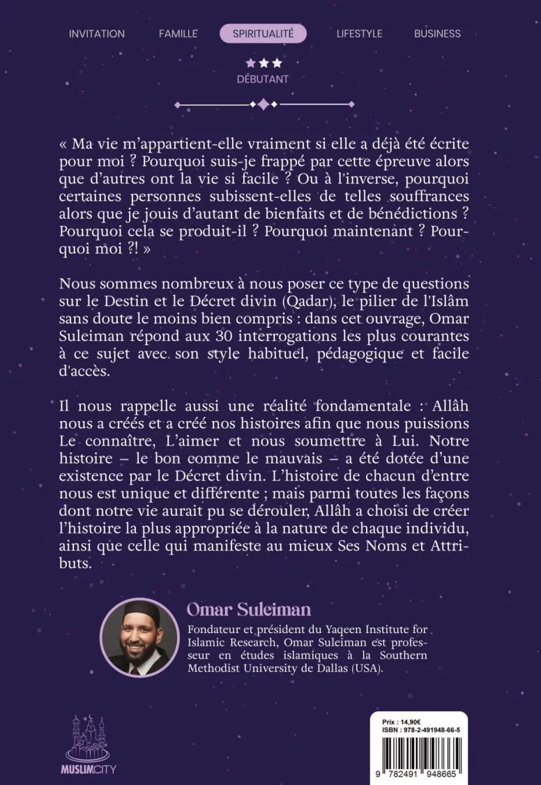 Nous sommes nombreux à nous poser ce type de questions sur le Destin et le Décret divin (Qadar), le pilier de l’Islâm sans doute le moins bien compris : dans cet ouvrage, Omar Suleiman répond aux 30 interrogations les plus courantes à ce sujet avec son style habituel, pédagogique et facile d’accès.