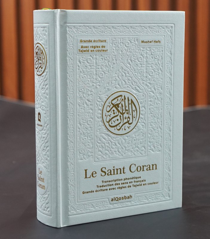 Version avec 1220 pages, grande écriture de l'arabe (grands caractères) et règles de tajwid en couleur. Couverture rigide cuir de luxe blanche dorée. Les trois marques pages (rouge, vert et jaune) vous permet de marquer et de réviser plusieurs sourates ou parties du Coran à la fois.