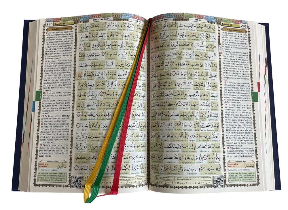 Les règles de tajwid sont données par un système de couleur intuitif pour apprendre les règles de lecture et de psalmodie du Saint Coran et le code QR (présent sur chaque page) permet d'ouvrir une vidéo sur son smartphone et d'écouter et suivre la lecture du Coran par cheikh Soudays.
