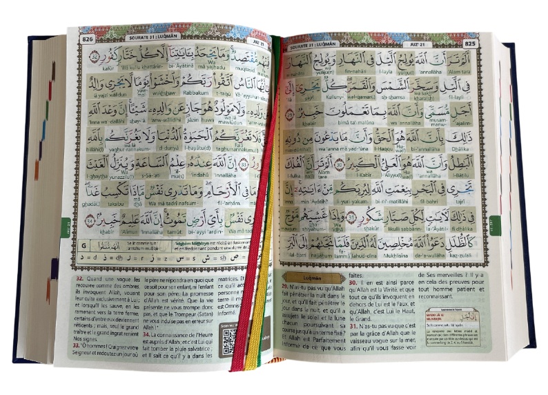 Les règles de tajwid sont données par un système de couleur intuitif pour apprendre les règles de lecture et de psalmodie du Saint Coran et le code QR (présent sur chaque page) permet d'ouvrir une vidéo sur son smartphone et d'écouter et suivre la lecture du Coran par cheikh Soudays.