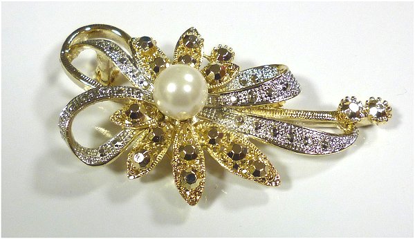Broche contenant des parties dorées et argentées, sous forme de fleur avec une grosse perle blanche et strass.