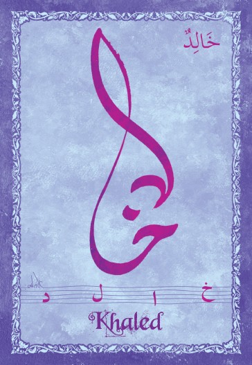 Jolie carte postale représentant le prénom arabe Khaled calligraphié en arabe ainsi que son épellation lettre par lettre en arabe. Derrière la carte postale se trouve la signification du prénom.