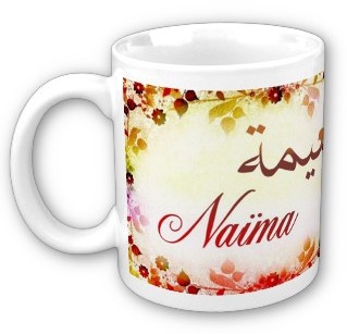 Mug avec le prénom Naïma calligraphié en arabe (نعيمة) ainsi que son épellation lettre par lettre en arabe.