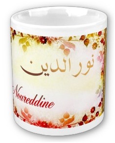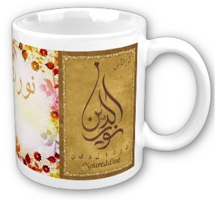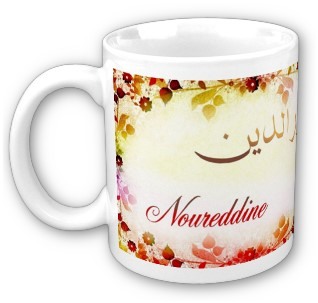 Mug avec le prénom "Noureddine" calligraphié en arabe (نور الدين) ainsi que son épellation lettre par lettre en arabe.