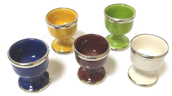 Coquetier artisanal en poterie, en provenance de Marrakech (Maroc), peint en jaune, émaillé, et cerclé de métal ornemental argenté, légèrement ciselé.