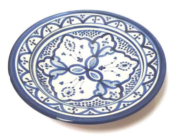 Assiette en céramique, en provenance de Marrakech (Maroc) de forme ronde, de couleur blanche et bleue, émaillée, décorée à la main avec de très beaux motifs traditionnels.