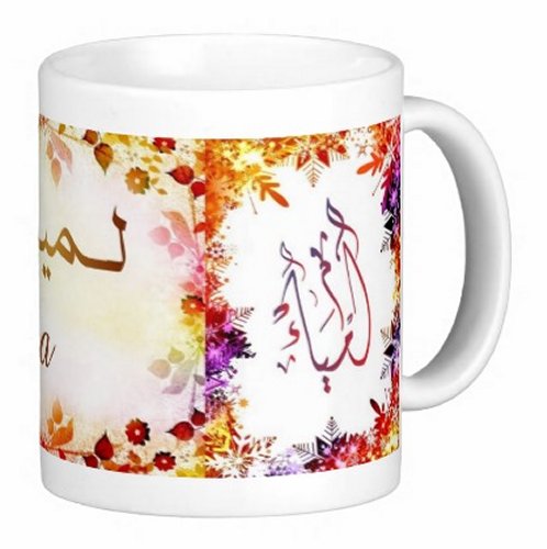 Mug avec le prénom "Lemia" écrit en français, en arabe (لمياء) et calligraphié de façon artistique en arabe sur la partie droite.