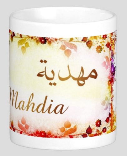 Mug avec le prénom "Mahdia" écrit en français, en arabe (مهدية) et calligraphié de façon artistique en arabe sur la partie droite.