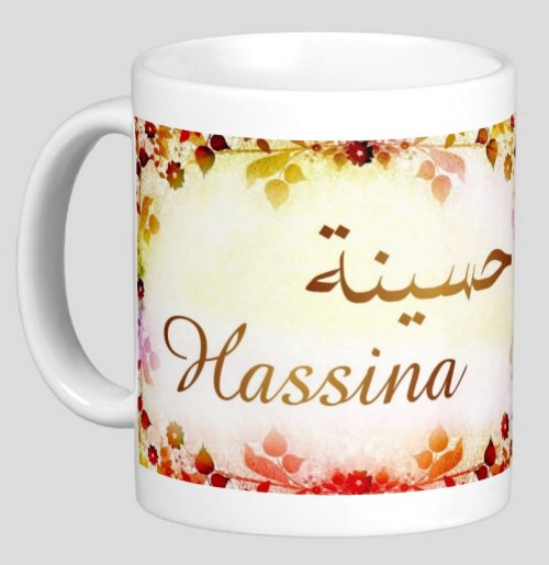 Mug avec le prénom "Hassina" écrit en français, en arabe (حسينة) et calligraphié de façon artistique en arabe sur la partie droite.