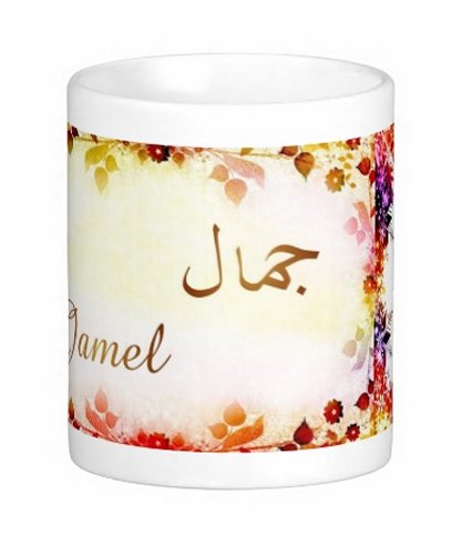 Mug avec le prénom "Jamel" écrit en français, en arabe (جمال) et calligraphié de façon artistique en arabe sur la partie droite.