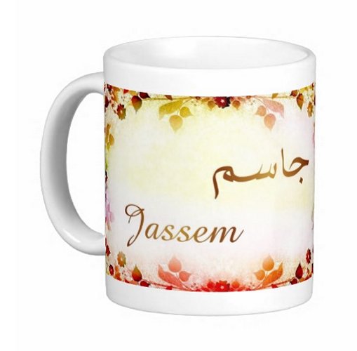 Mug avec le prénom "Jassem" écrit en français, en arabe (جاسم) et calligraphié de façon artistique en arabe sur la partie droite.
