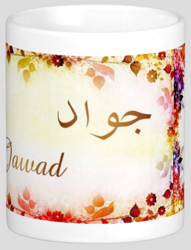 Mug avec le prénom "Jawad" écrit en français, en arabe (جواد) et calligraphié de façon artistique en arabe sur la partie droite.