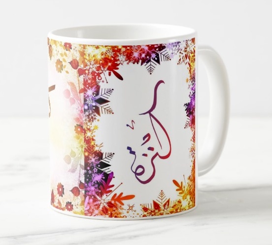 Mug avec le prénom "Kanza" écrit en français, en arabe (كنزة) et calligraphié de façon artistique en arabe sur la partie droite.