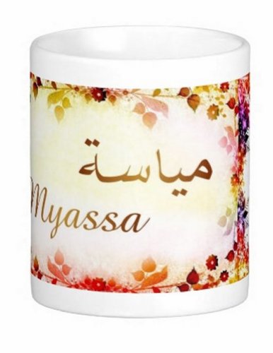Mug avec le prénom "Myassa" écrit en français, en arabe (مياسة) et calligraphié de façon artistique en arabe sur la partie droite.