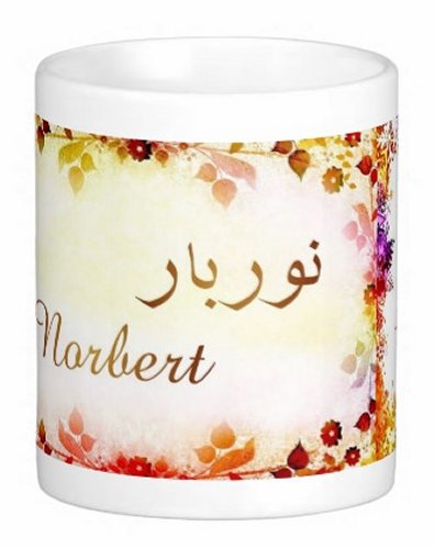 Mug avec le prénom "Norbert" écrit en français, en arabe (نوربار) et calligraphié de façon artistique en arabe sur la partie droite.