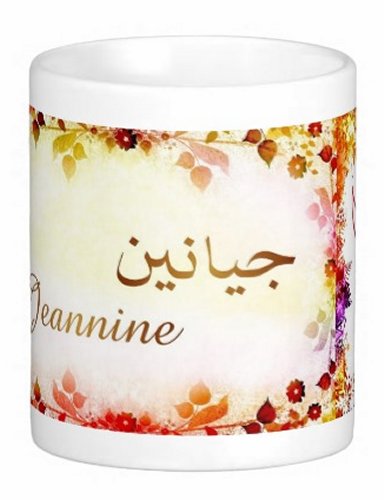 Mug avec le prénom "Jeannine" écrit en français, en arabe (جيانين) et calligraphié de façon artistique en arabe sur la partie droite.