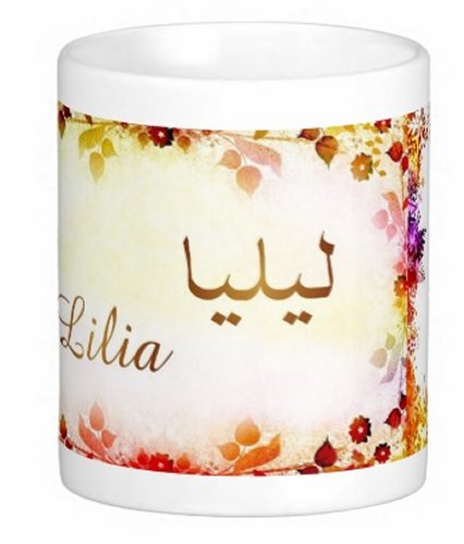Mug avec le prénom "Lilia" écrit en français, en arabe (ليليا) et calligraphié de façon artistique en arabe sur la partie droite.