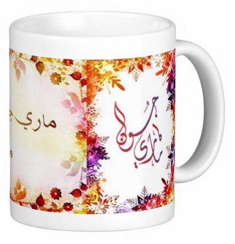 Mug avec le prénom "Marie-Jean" écrit en français, en arabe (ماري جون) et calligraphié de façon artistique en arabe sur la partie droite.