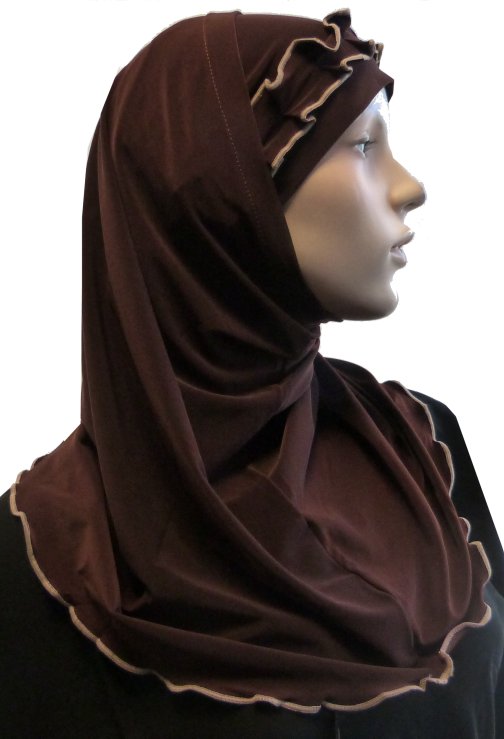 Très beau hijab 2 pièces marron chocolat avec ruban froncé piqué taupe.