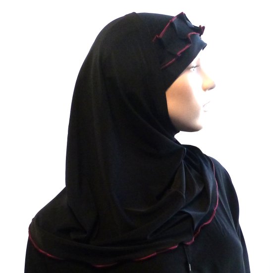 Très beau hijab 2 pièces noirs avec ruban froncé piqué bordeaux.