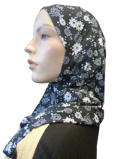 Hijab 1 pièce noir pailleté avec motifs fleurs blanches.