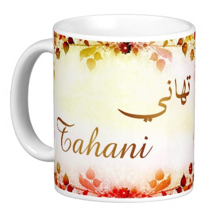 Mug avec le prénom "Tahani" écrit en français, en arabe (تهاني) et calligraphié de façon artistique en arabe sur la partie droite.