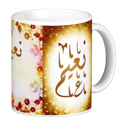 Mug avec le prénom "Naim" écrit en français, en arabe (نعيم) et calligraphié de façon artistique en arabe sur la partie droite.