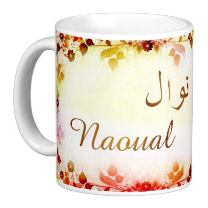 Mug avec le prénom "Naoual" écrit en français, en arabe (نوال) et calligraphié de façon artistique en arabe sur la partie droite.