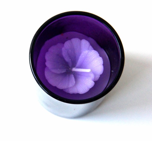 Bougie parfumée sous forme de fleur dans un verre violet pour un bel effet de lumière.