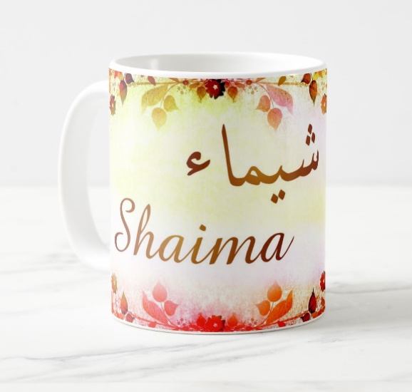 Mug avec le prénom Shaima calligraphié en arabe ainsi que son écriture normale en arabe (شيماء) et en français.
