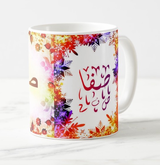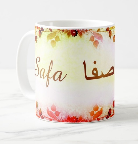Mug avec le prénom Safa calligraphié en arabe ainsi que son écriture normale en arabe (صفا) et en français.