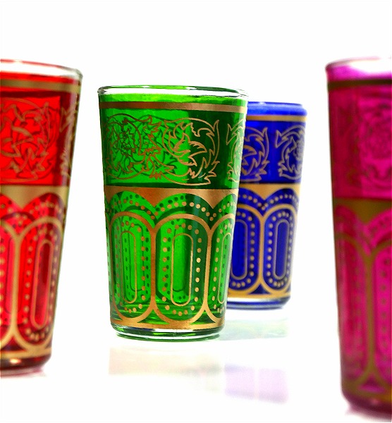 Vos dégustations de thé à la menthe seront désormais un plaisir éternel, avec ce lot de 6 verres à thé marocain, en provenance de Marrakech, avec plusieurs couleurs, et ornés de très beaux motifs traditionnels dorés...