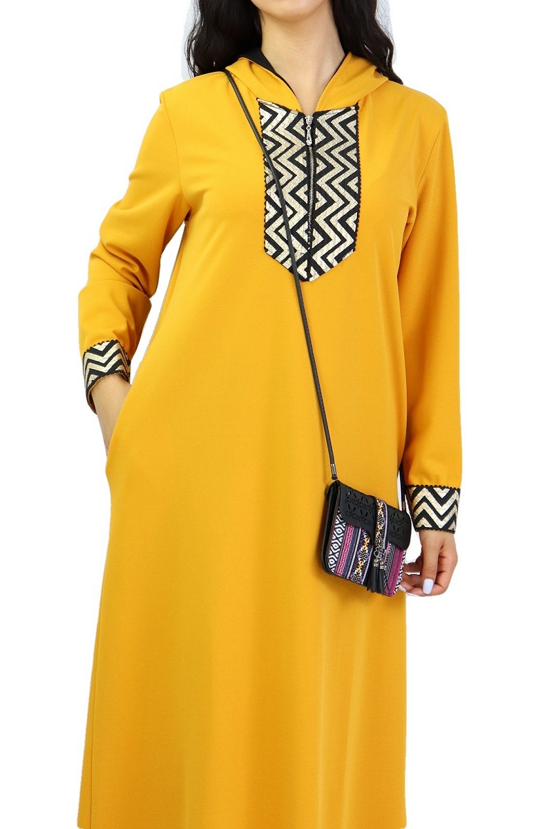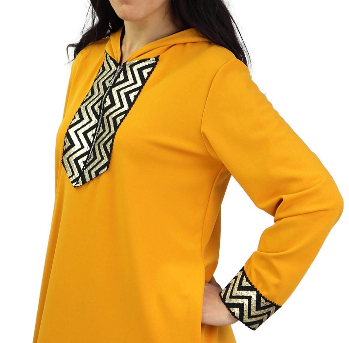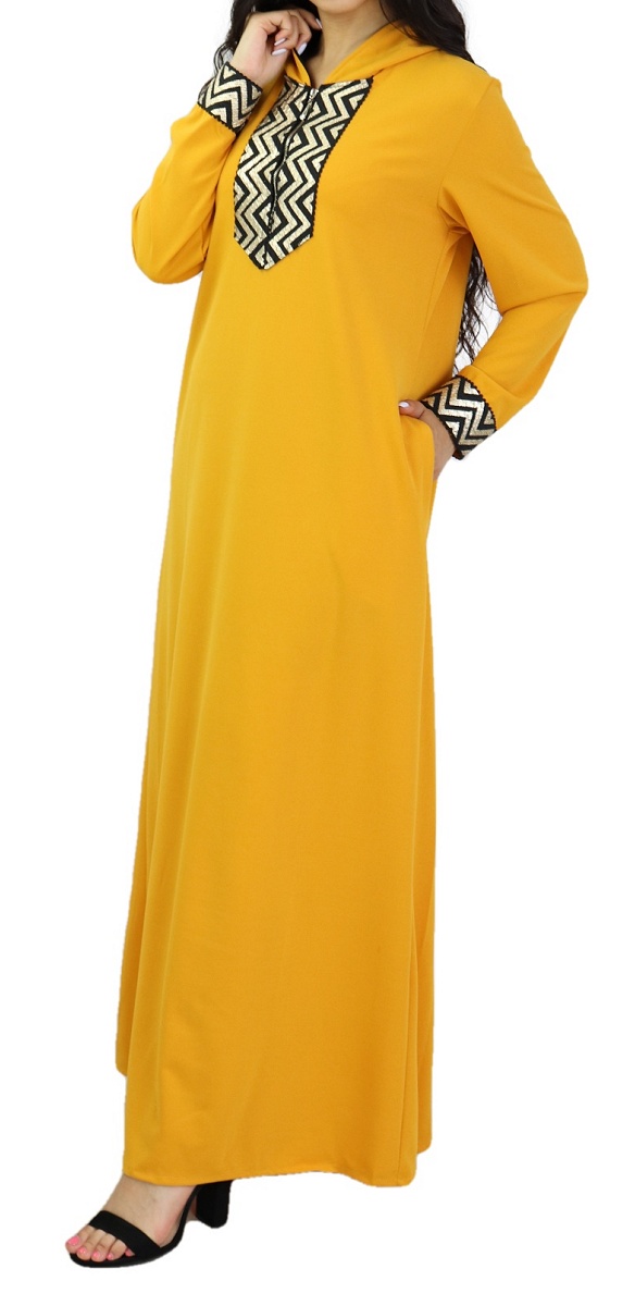 Robe longue type abaya marocaine moderne avec capuche et motifs dorés pour femme - Couleur jaune moutarde Vetement & Accessoire