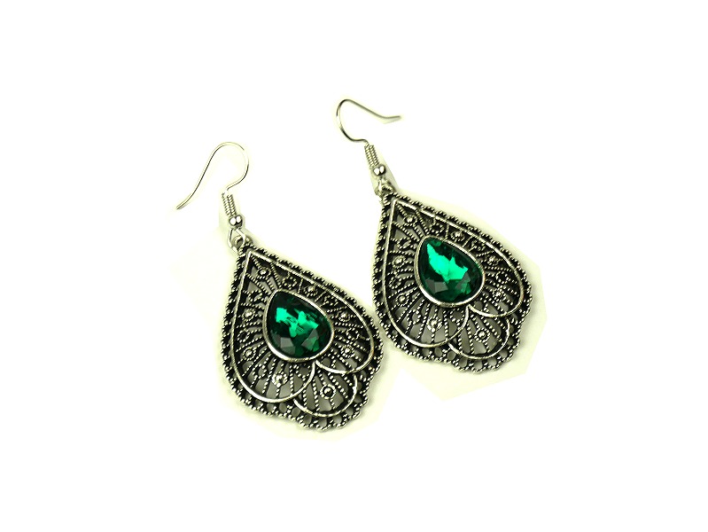 Boucles d'oreilles pendantes, style berbère, fabriquées en métal argenté - composition argent - délicatement ciselé, serties de pierres vert.