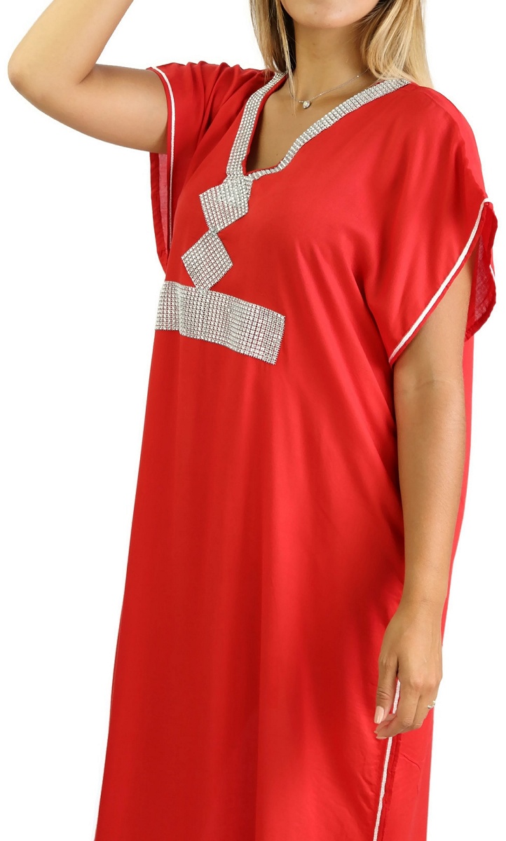 Belle gandoura traditionnelle marocaine,coupe droite col en V avec strass ainsi sur que la taille, ceinture à l'intérieur si on désire un effet cintré.