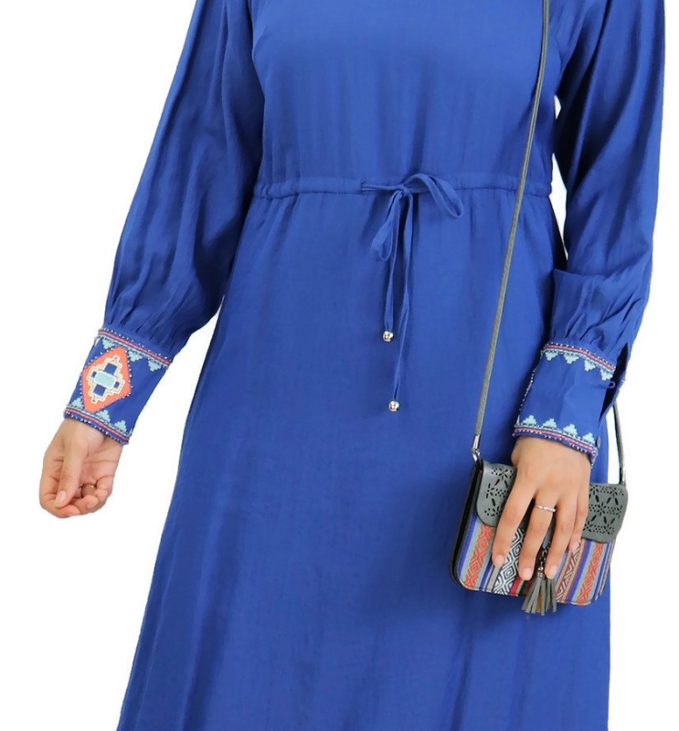 Robe longue bleue avec ceinture intégrée et broderies au niveau des manches Vetement & Accessoire