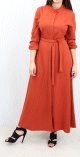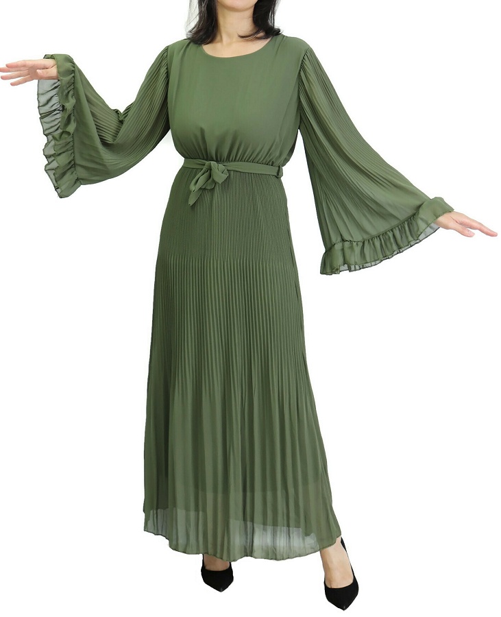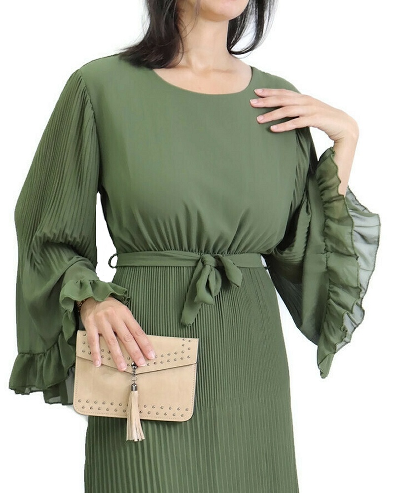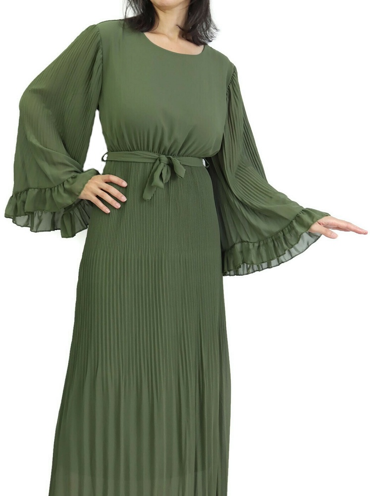Robe longue ajustable à la taille. Plissée en bas de la robe ainsi que sur les manches évasées, le tout accompagné d'une ceinture qui peut se mettre autour ou par derrière. Intérieur doublé. Tissu de type mousseline.