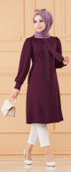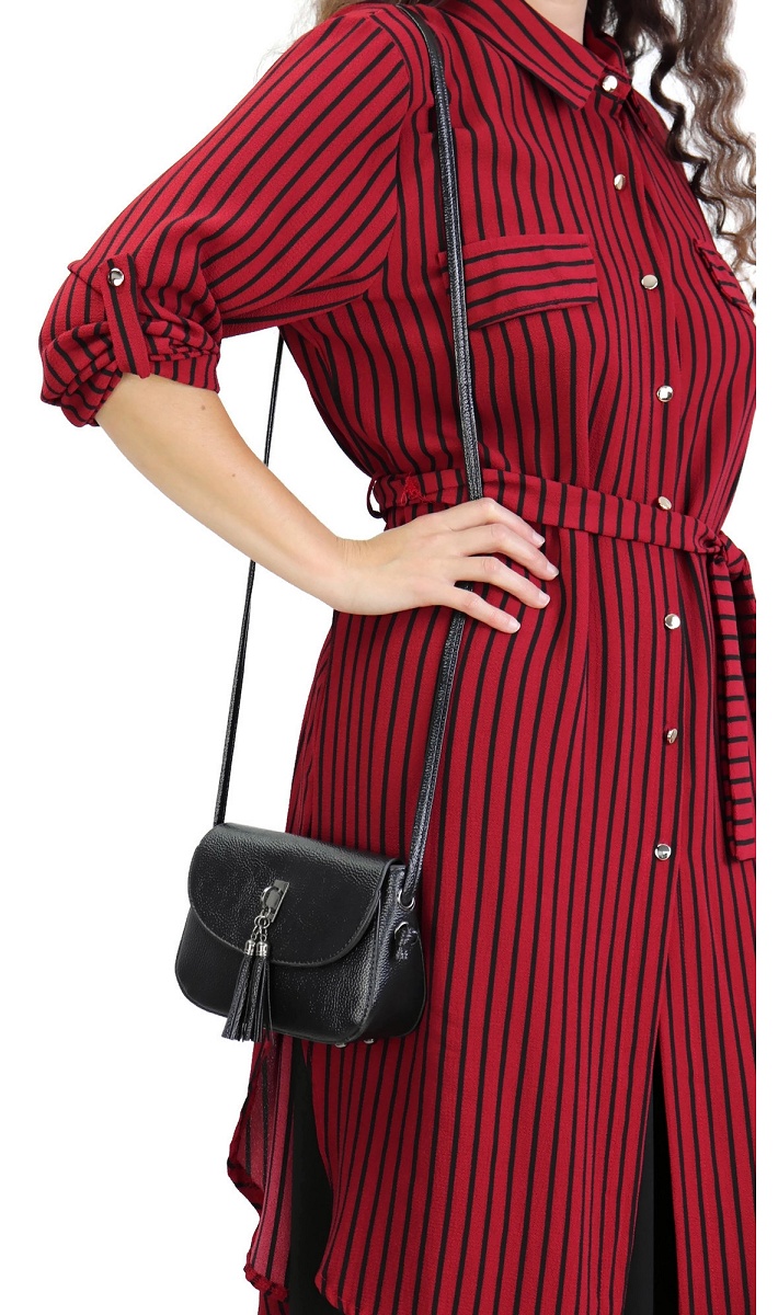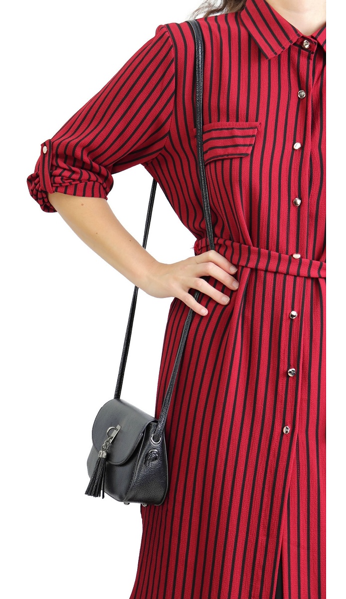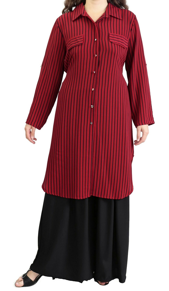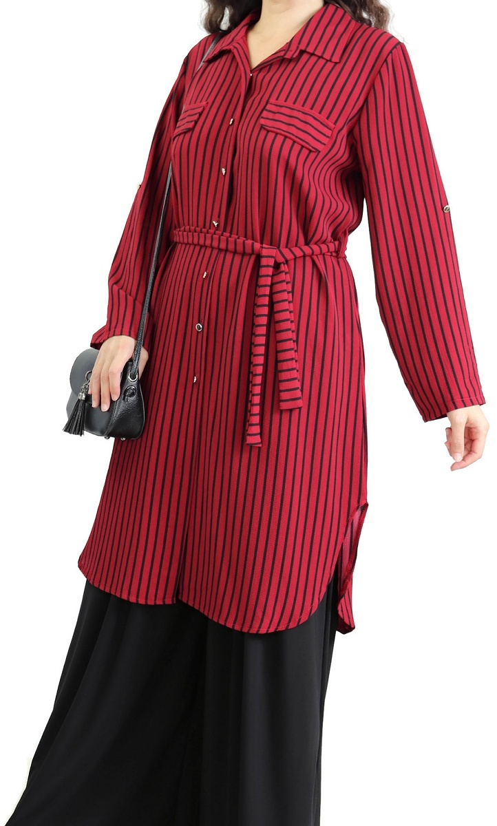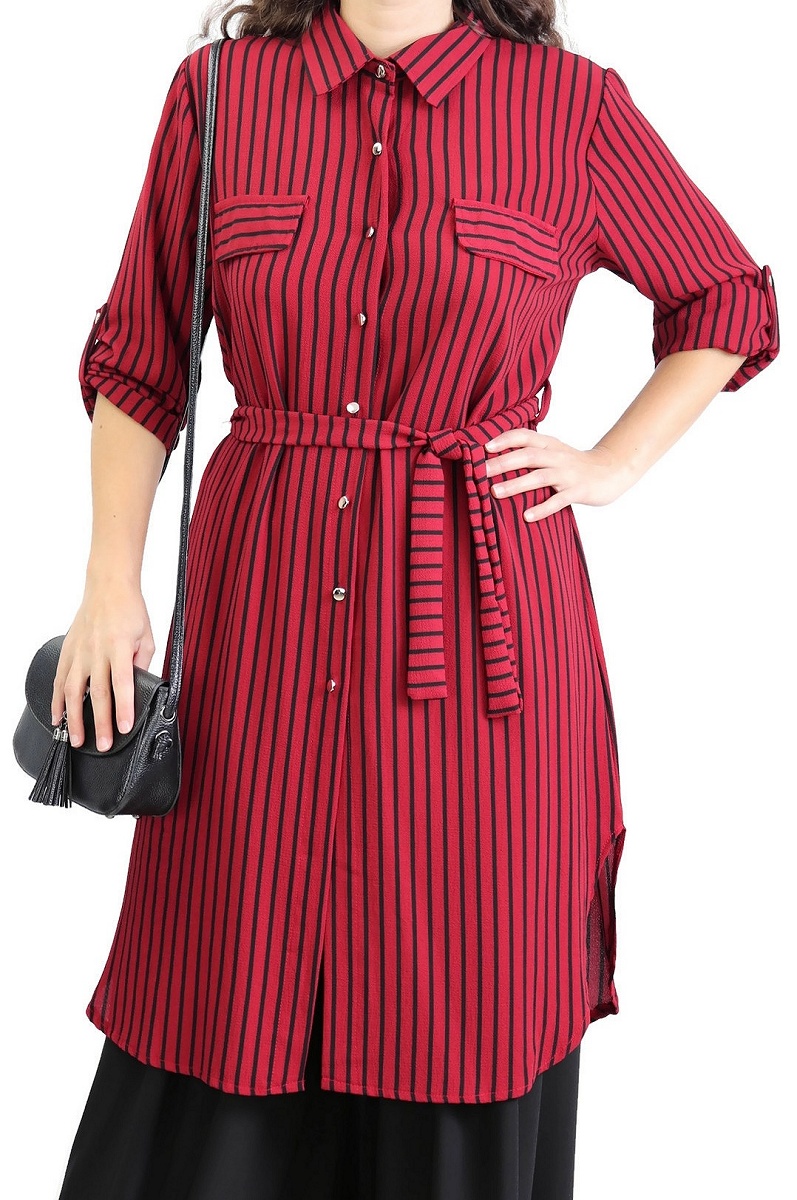 Chemise longue, manches ajustables, fermeture boutons, deux fausses poches plaquées, ceinture assortie, tissu effet crêpe, coupe droite.
