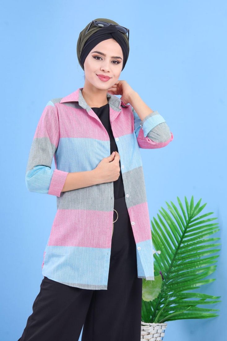 Chemise tricolore rose, bleu et vert, ultra légère et facile à porter, manches longues avec fermeture boutons. Vous pouvez la porter avec tout type de pantalon.