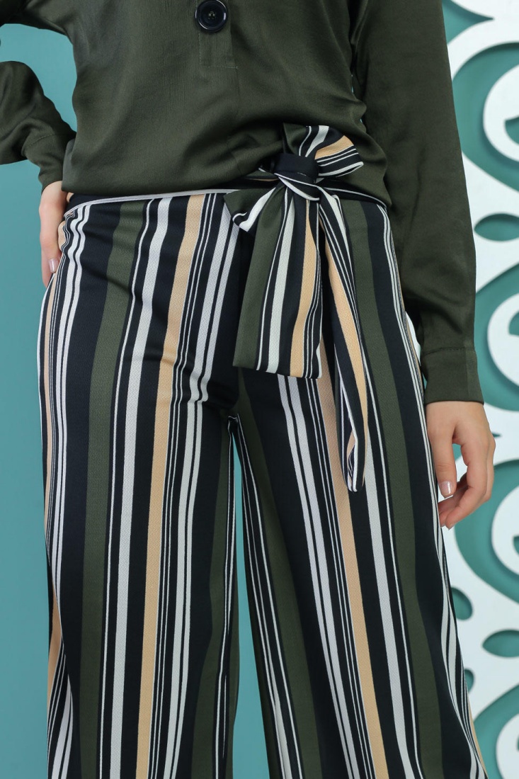 Pantalon femme a rayures blanches, noires, beiges et kakis (ceinture a motif)