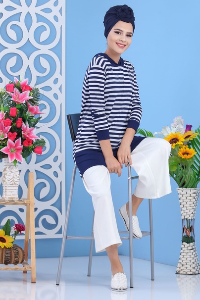 Tunique decontractee a capuche pour femme - Couleur blanche a rayures bleues marines