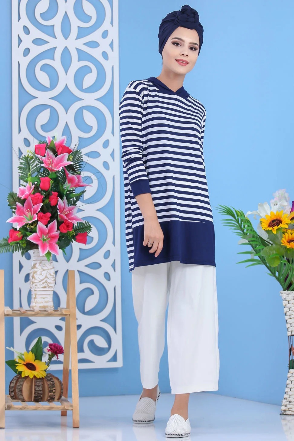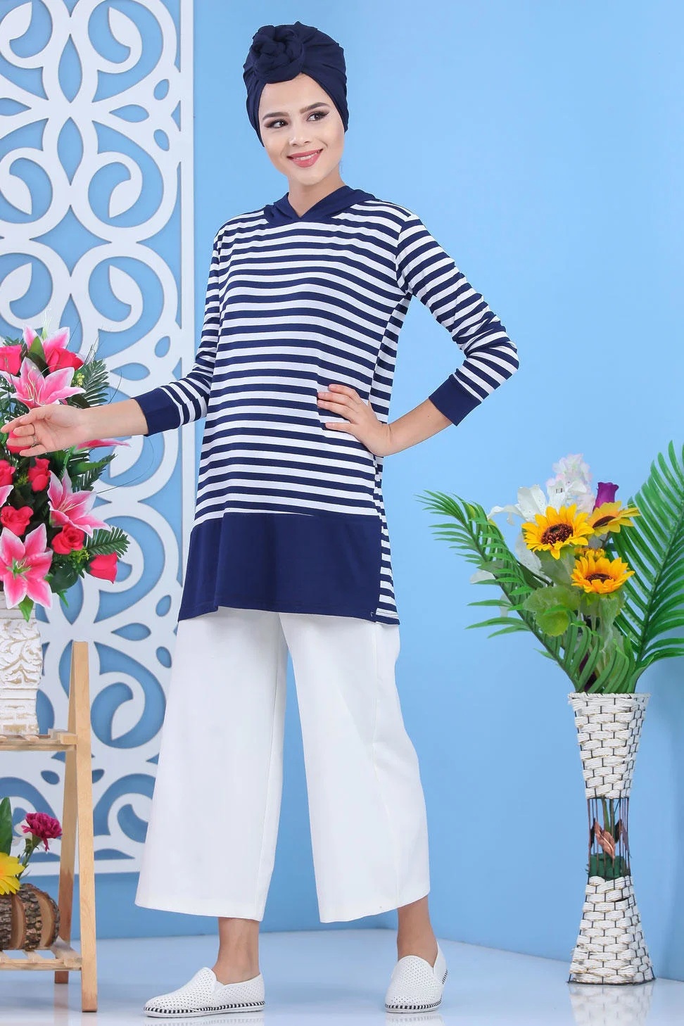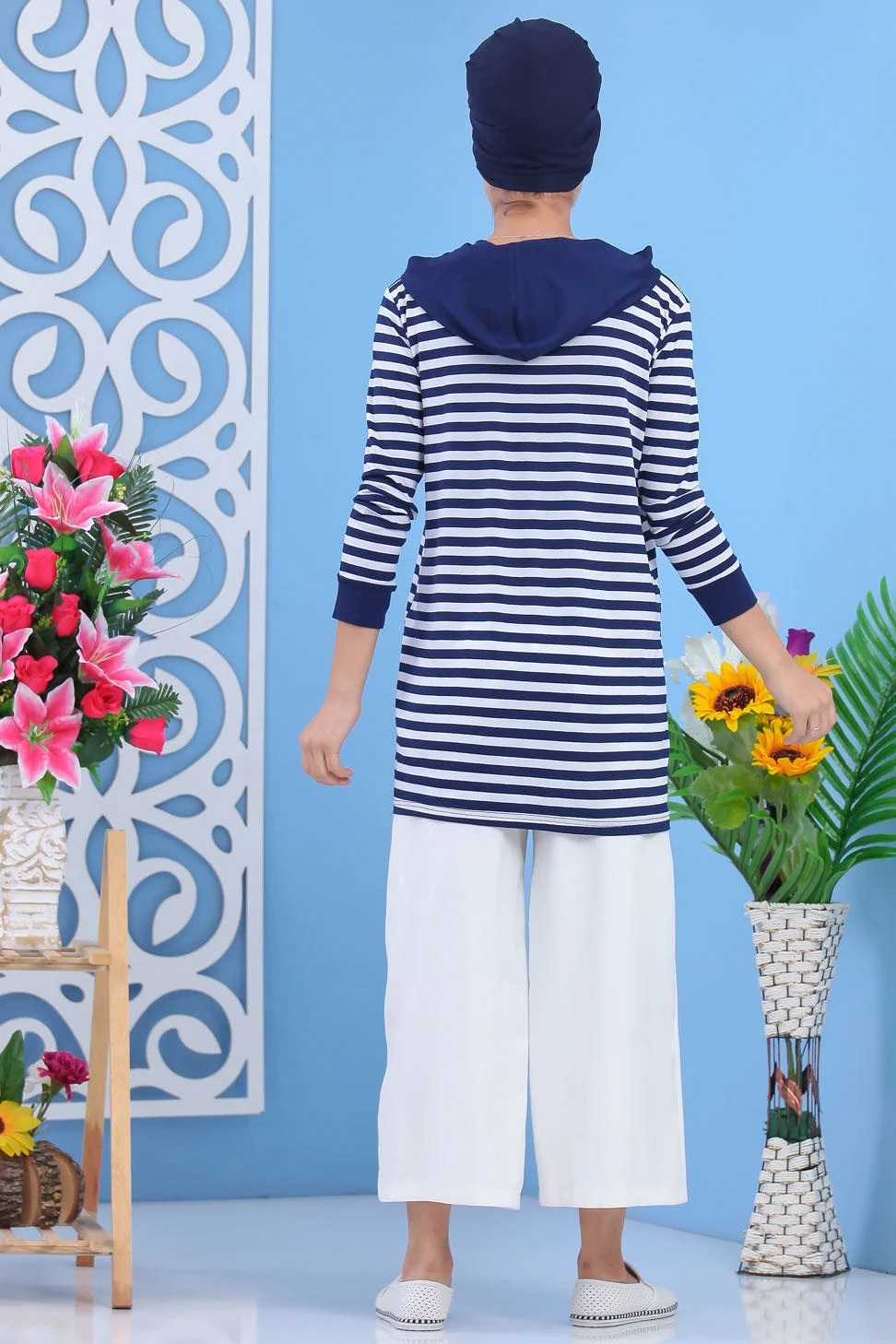 Tunique décontractée à capuche pour femme - Couleur blanche à rayures bleues marines Vetement & Accessoire
