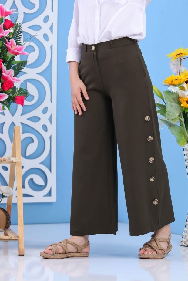 Pantalon effet jupe culotte, taille fermeture bouton, passants, 2 poches italiennes, coupe évasée, décoration boutons sur les cotés. Ce modèle amélioré, est de nouveau tendance, n’hésitez plus.