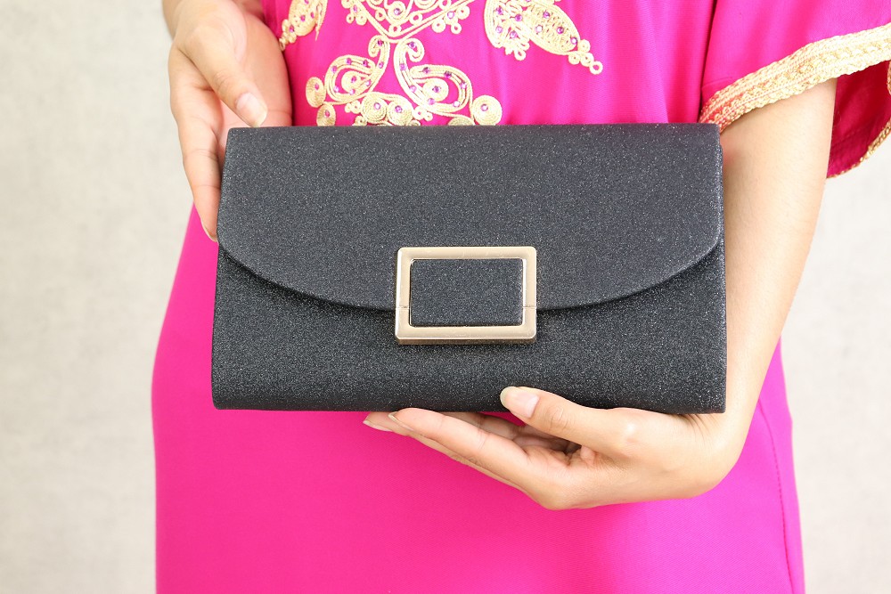 Grand sac à main pochette pour femme brillant avec micro strass. Il se porte à la main ou à l'épaule grâce à sa bandoulière en chaînette amovible. Fermeture à rabat avec bouton-pression. Partie métallique au niveau de la fermeture.
