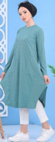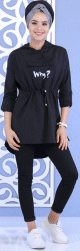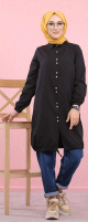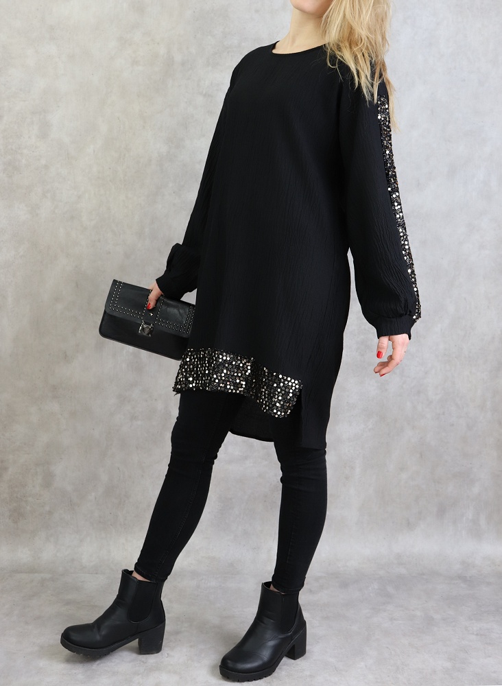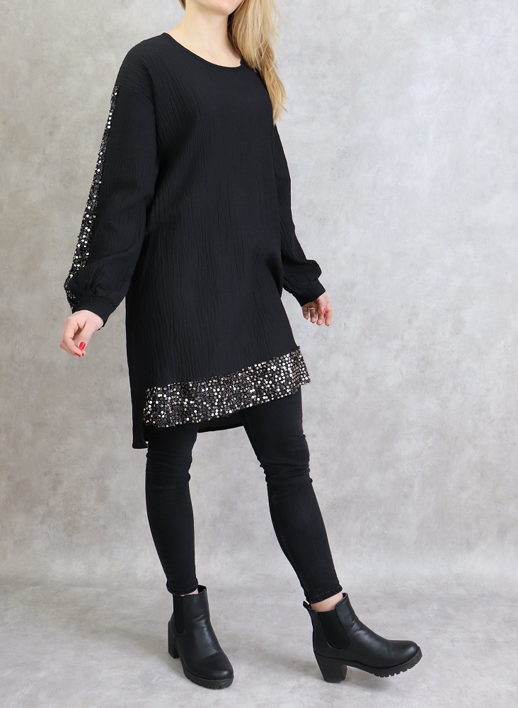 Tunique longue, col arrondi, strass sur les manches ainsi que sur le bas, tissu effet crêpe, coupe ample.