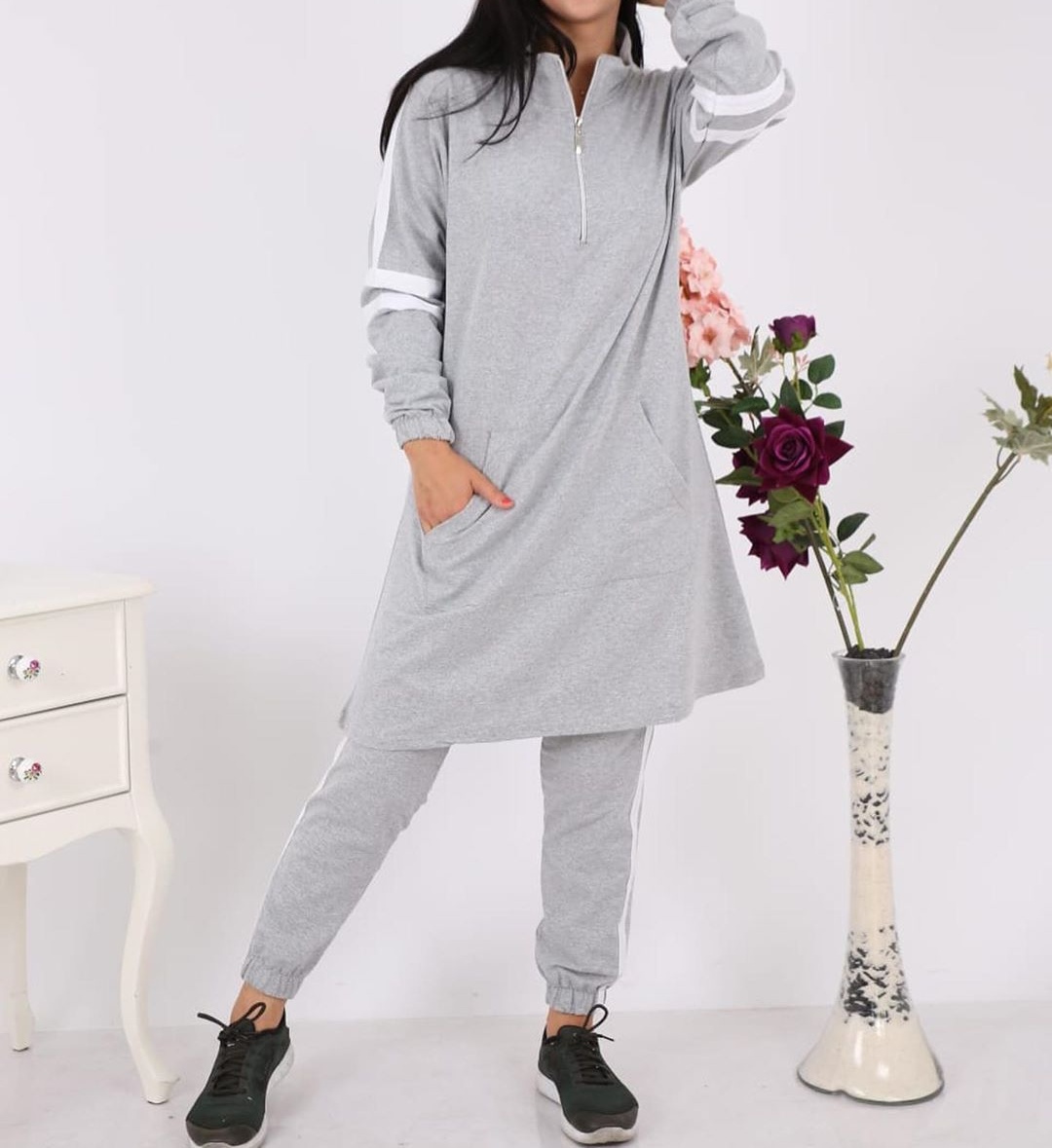 Survêtement avec sweat-shirt à capuche et jogger basique en coton (Hijab Sport pour femme musulmane) - Couleur gris clair - REF. 33194 (29.90 €)