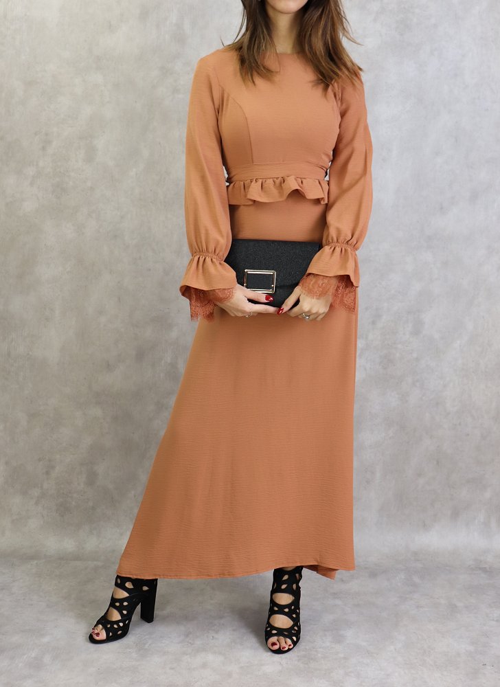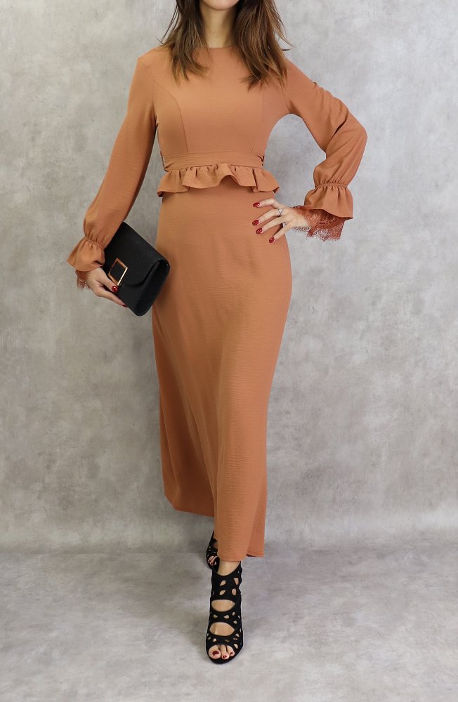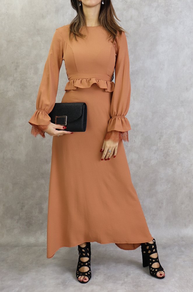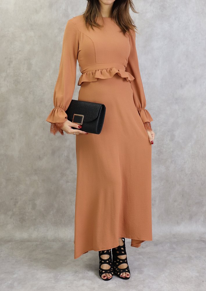 Robe longue fluide casual évasée à volants pour femme - Couleur marron caramel Vetement & Accessoire