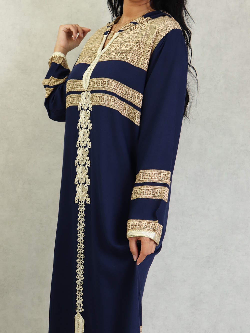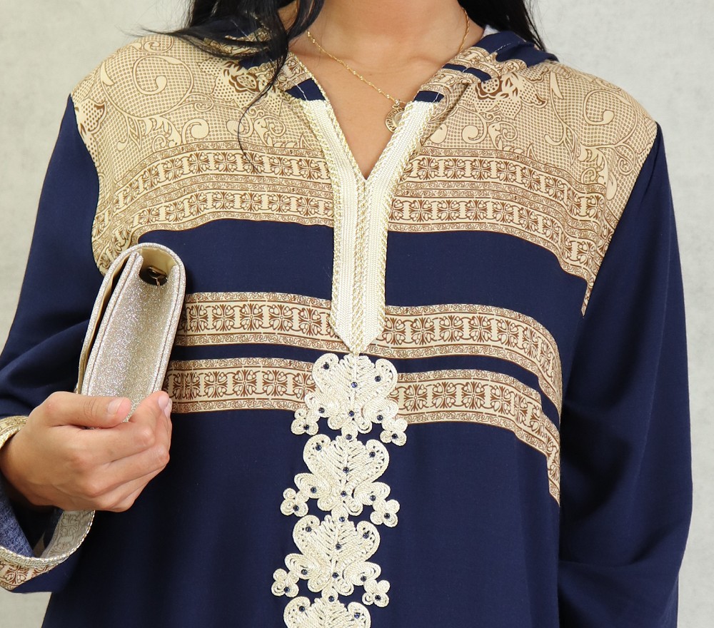 Robe arabe longue a capuche avec broderie et strass pour femme - Couleur Bleu marine